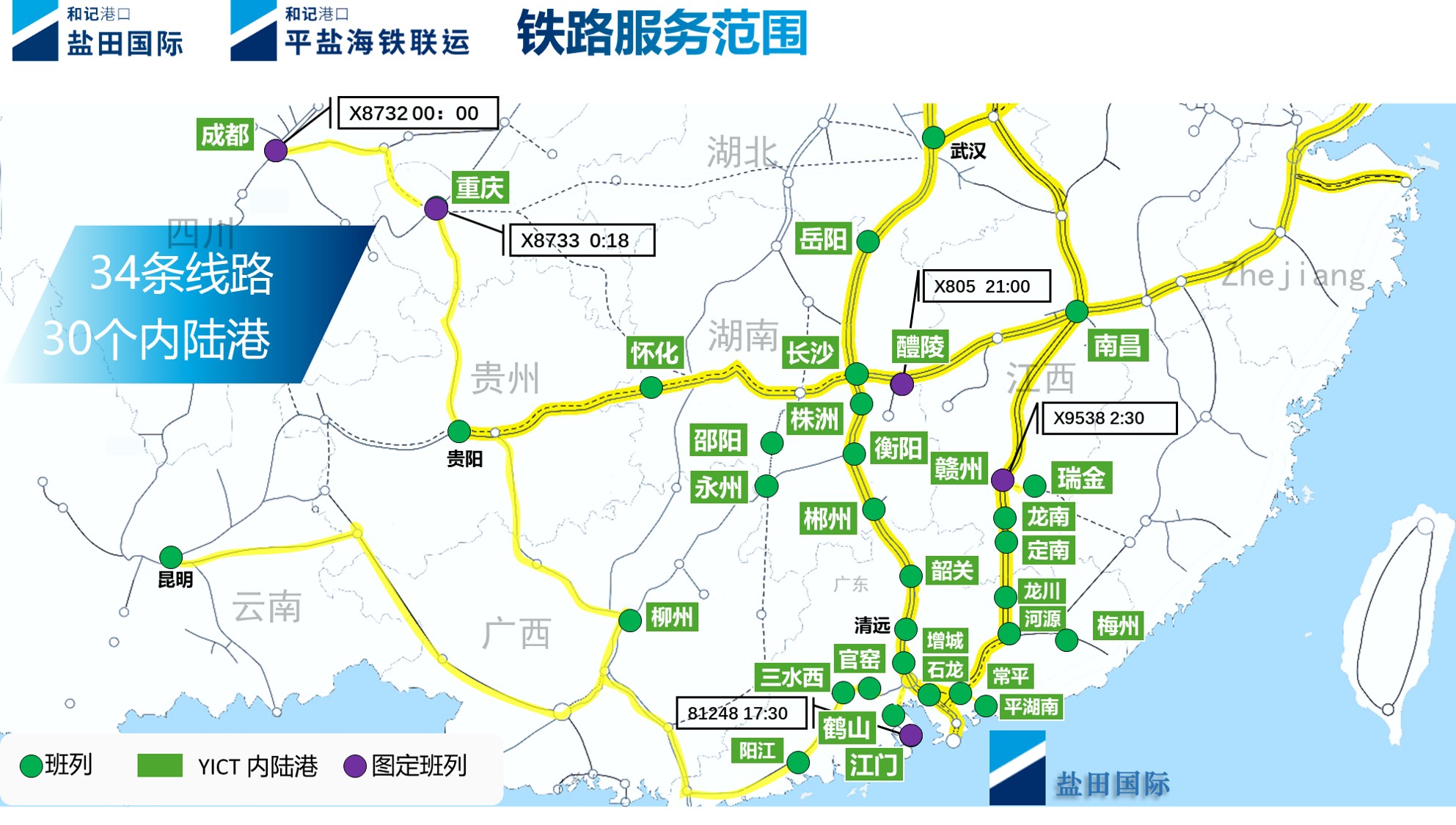 官窑、石龙、韶关、三水西、阳江、增城、清远)、湖南(醴陵、岳阳、郴州、永州、怀化、邵阳、株洲、衡阳、长沙)、江西(赣州、南昌、龙南、定南)、重庆(重庆)、四川(成都)、广西(柳州)。通过内陆港布局,将盐田港的部分码头服务前置至内陆腹地,客户可在内陆港直接提还柜,降低货损风险、缩短物流时效、节约工厂成本,客户在家门口即可享受港口服务。