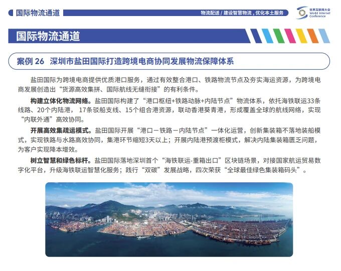 本次征集的案例围绕案例主体覆盖政府机构、高等院校、科研单位、金融机构、国际组织、行业协会及各类企业展开,盐田国际收录于“03物流配送 | 建设智慧物流,优化本土服务”中。本领域案例聚焦于跨境电商国际通道互联互通、物流网络化智能化、供应链数智化等方面的创新举措。